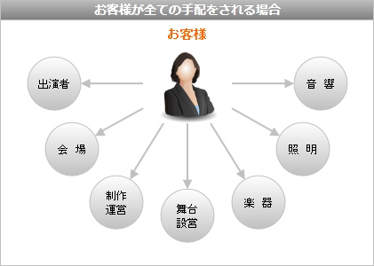 必要物品の手配や各部門との連絡、打ち合わせをはじめ、イベントを実施するためのあらゆる業務を代行しますので、